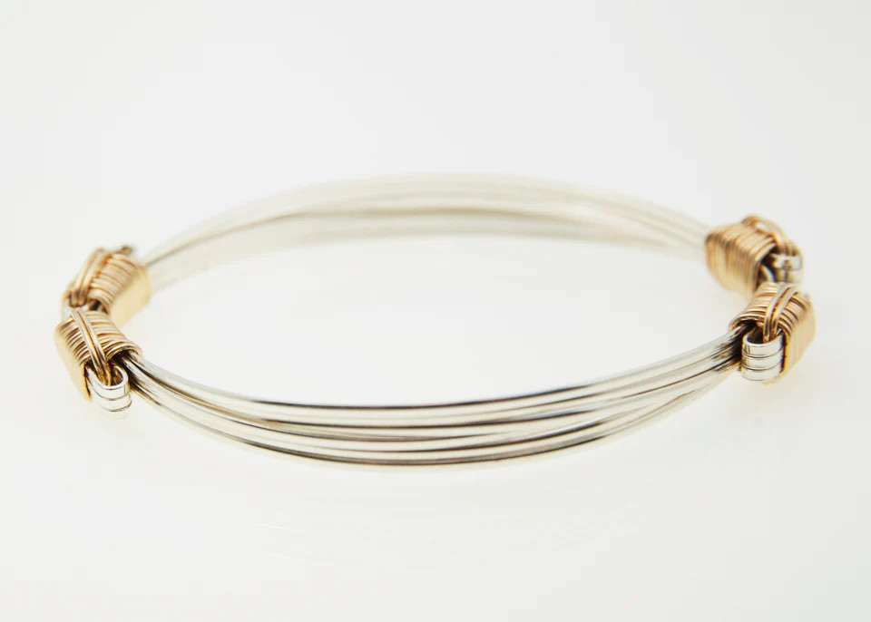 Crafted with the highest quality materials, the body of the bracelet is made of lightweight 16 gauge Sterling Silver wire, while the contrasting knots are hand-wrapped in 14Kt Gold Fill.