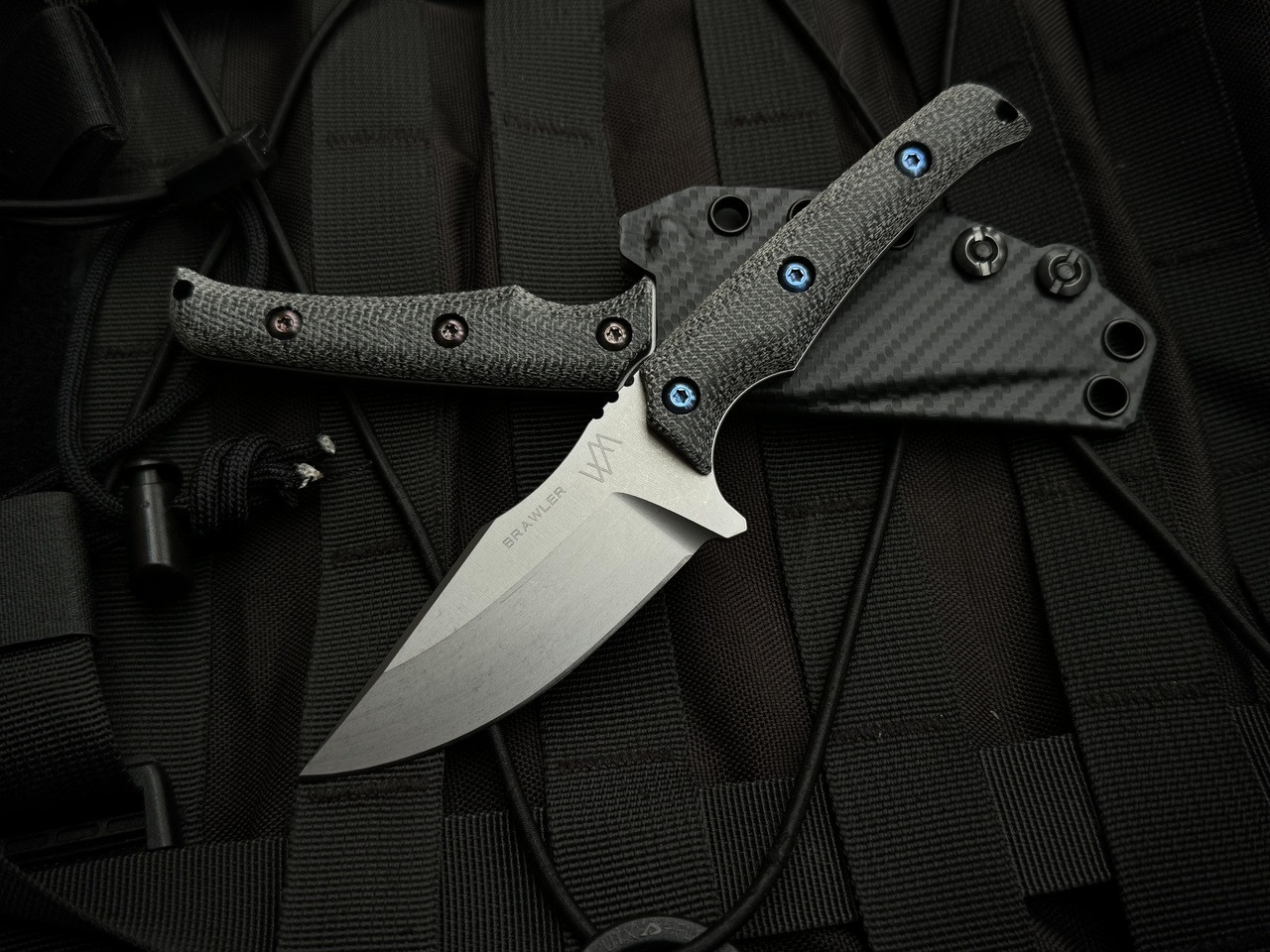 WelMade Brawler Fixed Blade Black Micarta Handles w/ Blue Titanium Hardware and 154CM Stonewashed Plain Edge Blade (3")