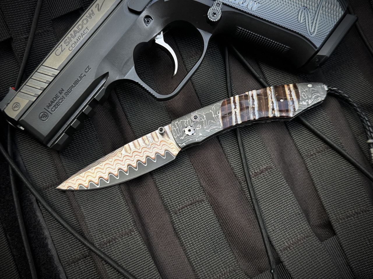 The Spearpoint ‘Copper Curl' features a mesmerizing frame of hand-forged 'T-Rex' damascus by Delbert Ealy, inlaid with a stunning piece of 10,000 year-old fossil Woolly Mammoth tooth. The blade is William Henry's 'Copper Wave' damascus with VG-5 core; the one-hand button lock and the thumb stud are set with spinel gemstones.